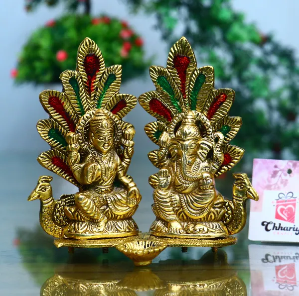 Gold Laxmi Ganesh Idol Statue With Diya Peacock Design Decorative Showpiece