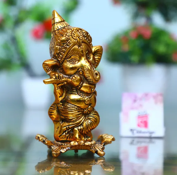 Gold Metal Lord Ganesh Playing Flute Decorative Showpiece
