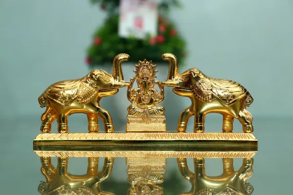 Golden Metal Elephant Pair With Ganesh Chandan Roli Pair Kumkum Box For Gif..More