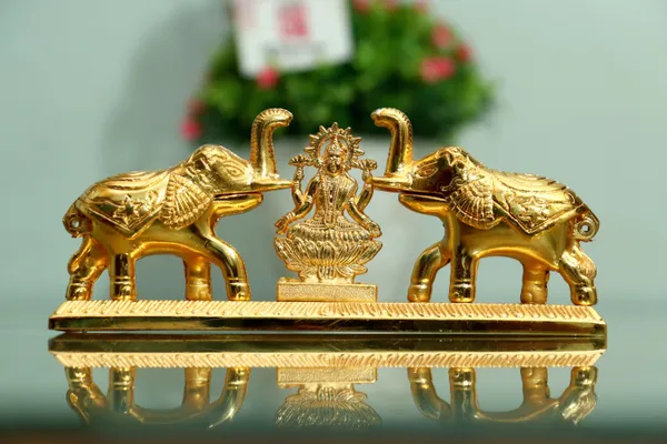 Golden Metal Elephant Pair With Laxmi Chandan Roli Pair Kumkum Box For Gift..More