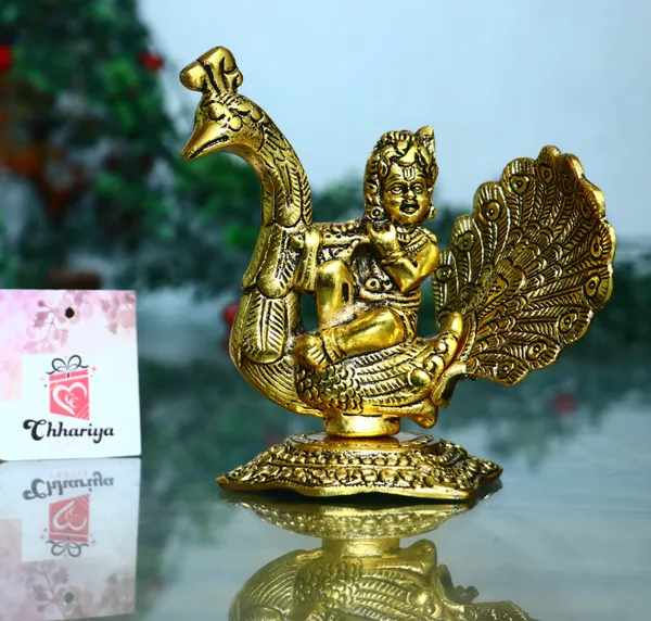 Golden Metal Krishna Sitting On Peacock And Playing Flute Wi Decorative Sho..More