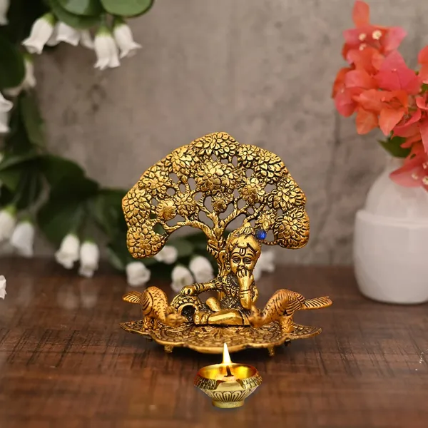 Golden Metal Krishna Sitting Under Tree With Peacock And Diya Decorative Sh..More