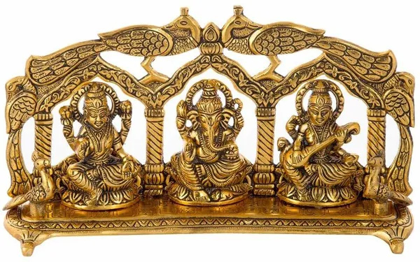 Golden Metal Laxmi Ganesh Saraswati Statue Idol Peacock Back Frame Decorati..More
