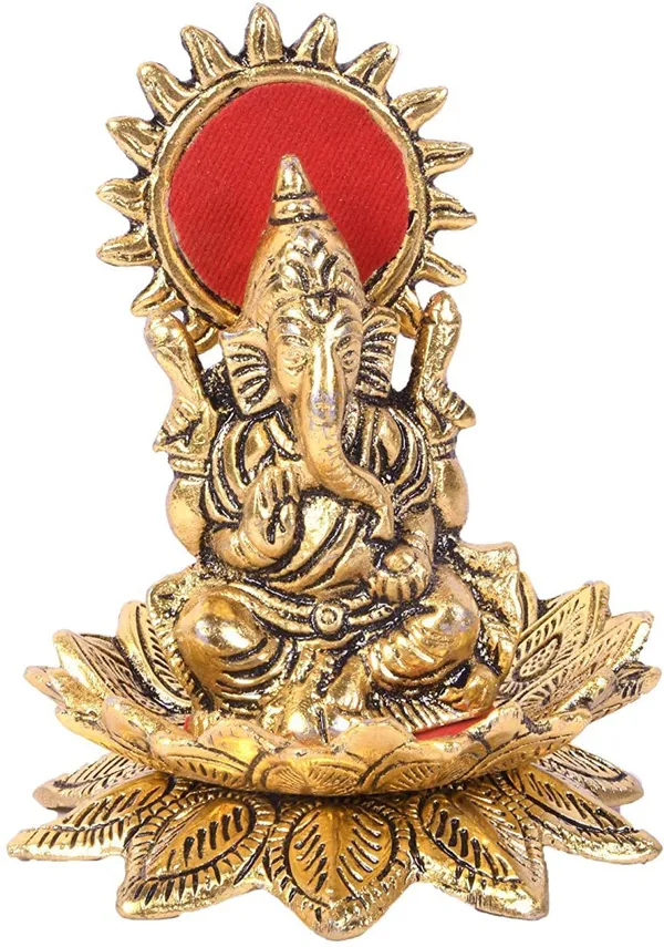 Golden Metal Lord Ganesh Sitting On Lotus Flower Decorative Showpiece