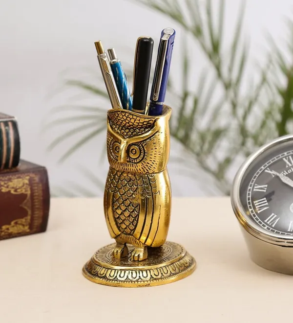 Golden Metal Owl For Good Luck Vastu Item With Pen Stand For Home And Offic..More