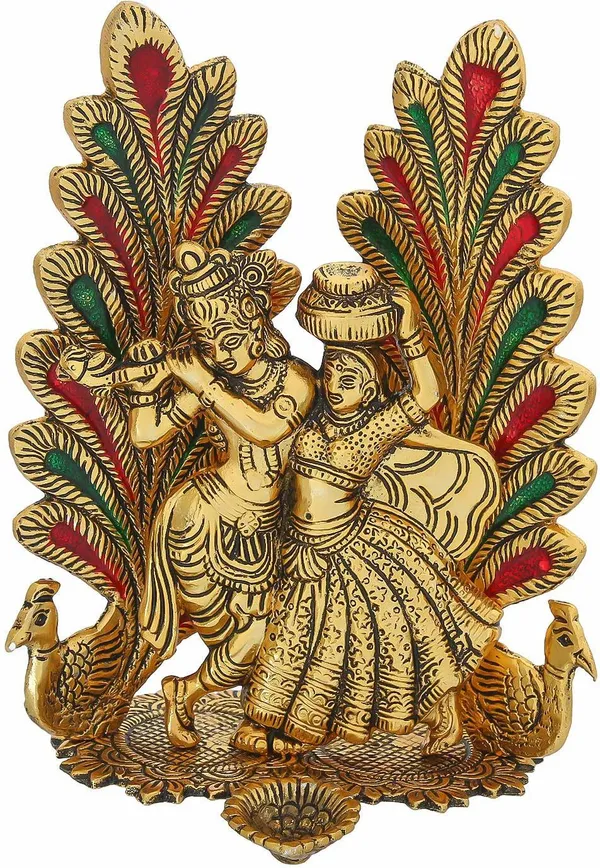 Golden Metal Radha Krishna Idol Statue With Diya Peacock Design Decorative ..More