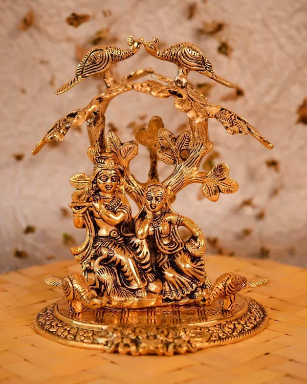 Golden Metal Radha Krishna Sitting Under Tree Plying Flute Decorative Showp..More